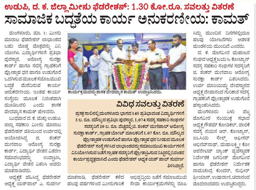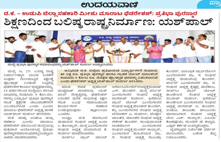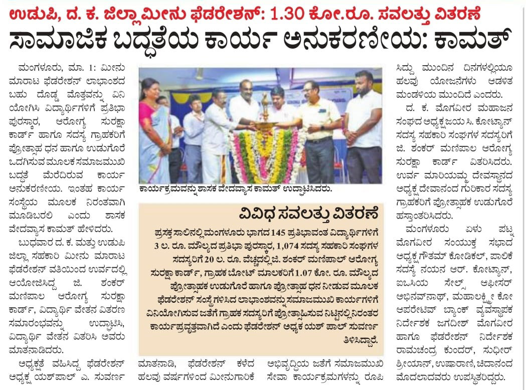 ದಿನಾಂಕ: 08.02.2025 ರಂದು ಏಳೂರು ಮೊಗವೀರ ಸಭಾ ಭವನ ಮಲ್ಪೆ ಇಲ್ಲಿ ದ.ಕ ಮತ್ತು ಉಡುಪಿ ಜಿಲ್ಲಾ ಸಹಕಾರಿ ಮೀನು ಮಾರಾಟ ಫೆಡರೇಶನ್ ಮಂಗಳೂರು ಇದರ ಉಡುಪಿ ಜಿಲ್ಲೆಯ 1050 ಪ್ರತಿಭಾವಂತ ವಿದ್ಯಾರ್ಥಿಗಳಿಗೆ ರೂ 25 ಲಕ್ಷ ಮೊತ್ತದ ಪ್ರತಿಭಾ ಪುರಸ್ಕಾರವನ್ನು ನೀಡಲಾಯಿತು.