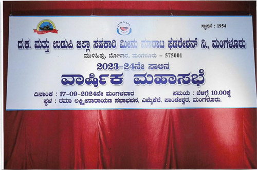ದ.ಕ ಮತ್ತು ಉಡುಪಿ ಜಿಲ್ಲಾ ಸಹಕಾರಿ ಮೀನು ಮಾರಾಟ ಫೆಡರೇಶನ್ ನಿ., ಮಂಗಳೂರು ಇದರ 2023-24 ನೇ ಸಾಲಿನ ವಾರ್ಷಿಕ ಮಹಾಸಭೆಯು ದಿನಾಂಕ: 17.09.2024 ರಂದು ರಮಾಲಕ್ಷ್ಮೀ ನಾರಾಯಣ ಸಭಾಭವನ, ಎಮ್ಮೆಕೆರೆ, ಪಾಂಡೇಶ್ವರ, ಮಂಗಳೂರು ಇಲ್ಲಿ ಜರಗಿತು.