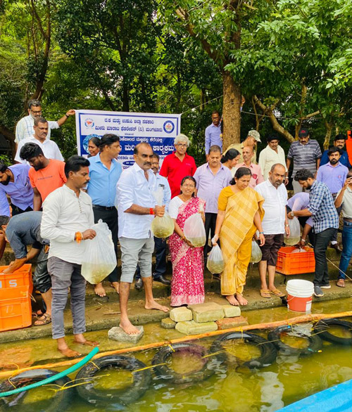 Stocking of Advanced fish fingerlings reared at Krishi Viigyan Kendra, Brahmavara to Mannapala lake Manipala in the presence of Shri Yashpal A Suvarna MLA Udupi Constituency and President. S.K and Udupi District Co-operative Fish Marketing Federation Mulihithlu, Mangalore; Smt. K. Vidya Kumari K, Deputy Commissioner of Udupi; Directors of Federation; Staff and Public.
