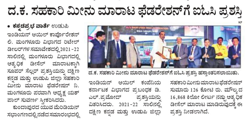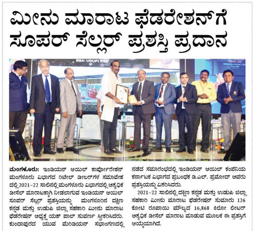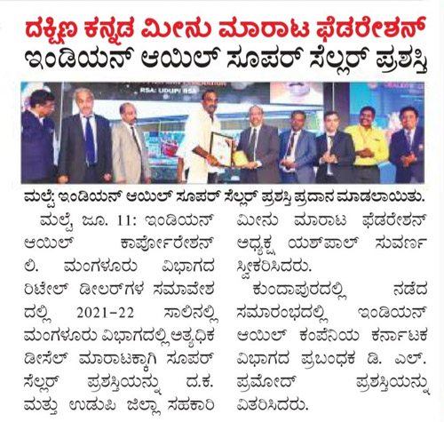 ಇಂಡಿಯನ್ ಆಯಿಲ್ ಕಾರ್ಪೋರೇಶನ್ ಲಿ. ಮಂಗಳೂರು ವಿಭಾಗದ ರಿಟೇಲ್ ಡೀಲರ್ ಗಳ ಸಮಾವೇಶದಲ್ಲಿ 2021-22 ಸಾಲಿನಲ್ಲಿ ಮಂಗಳೂರು ವಿಭಾಗದಲ್ಲಿ ಅತ್ಯಧಿಕ ಡೀಸೆಲ್ ಮಾರಾಟಕ್ಕಾಗಿ ಸೂಪರ್ ಸೆಲ್ಲರ್ ಪ್ರಶಸ್ತಿಯನ್ನು ಪಡೆಯಲಾಯಿತು